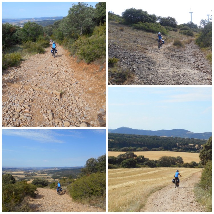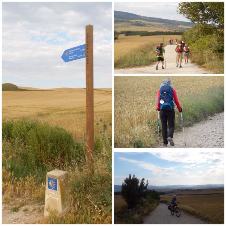 Nada más salir de Pamplona se ven a lo lejos las siluetas de los aerogeneradores en lo alto de la Sierra del Perdón hacia la que nos dirigimos. Decenas de peregrinos a pie y unos cuantos en bici seguimos la misma pista pedregosa que empieza a ganar altura poco a poco entre campos de cereal. De vez en cuando hay algún repecho que nos hace sufrir y como pasa siempre más de un caminante alucina al ver «como sube la niña»