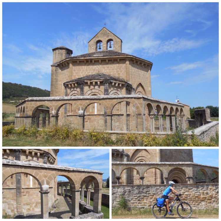 Tras descender el Alto del Perdón seguimos circulando entre campos hasta que en Muruzabal tomamos la variante que pasa por la Ermita de Eunate, de forma octogonal y de la que no se conoce bien su origen. Por eso hay muchas leyendas esotéricas tipo «cuarto milenio» sobre ella. De hecho hemos visto a un tipo dando vueltas y vueltas alrededor de la ermita mientras parecía hablar solo. Debía estar cargándose de energía o algo así y hemos estado pensado lo qué le pasaría si se equivoca y gira en la dirección equivocada…