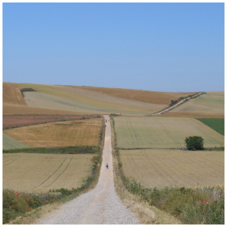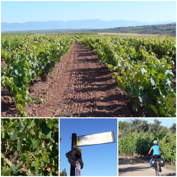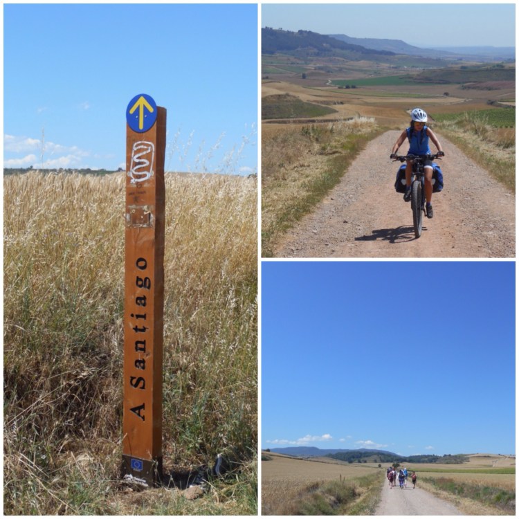 Después de Nájera los viñedos van desapareciendo y predominan grandes campos de trigo. La temperatura debe ser la misma pero los campos dorados dan la sensación de más calor que cuando estábamos rodeados de verde. Vamos coincidiendo con otros ciclistas a los que adelantamos y nos vuelven a adelantar durante todo el día según el ritmo de cada uno y las paradas que haga. Hay tres brasileños, por ejemplo, con los que coincidimos subiendo al Alto del Perdón hace dos días y que desde entonces vamos encontrando de vez en cuando.