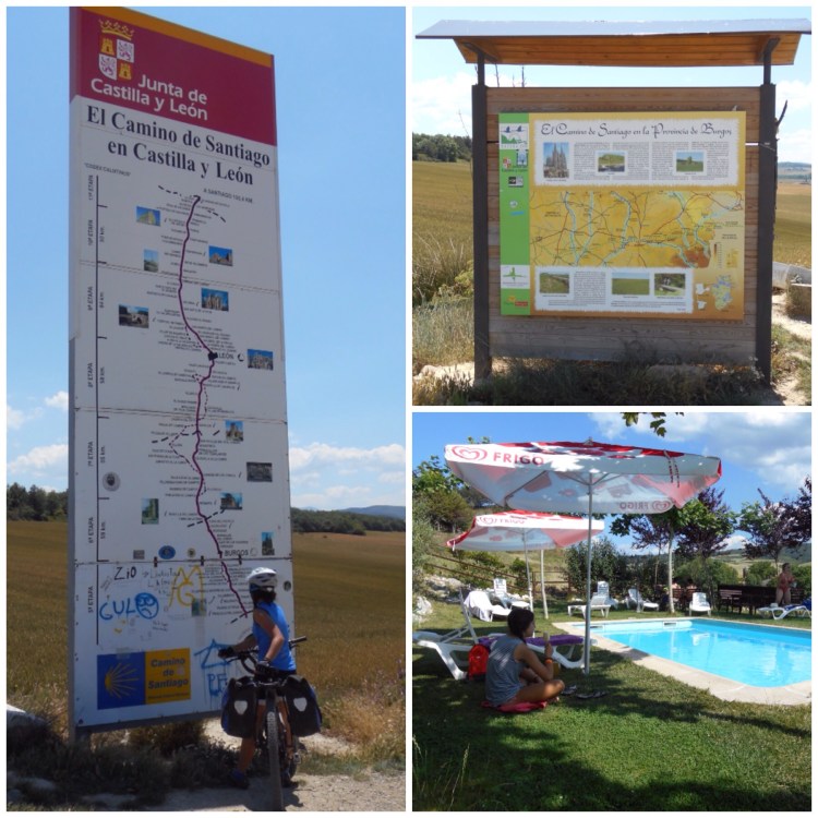 Poco después de Santo Domingo, el Camino deja La Rioja para entrar en Castilla y León, en la provincia de Burgos. Los últimos kilómetros no se acababan nunca, achicharrados de calor. En Viloria de Rioja (que no está en Rioja sino en Burgos, cosas de la historia) nos hemos parado una vez más a la sombra para coger fuerzas para los últimos kilómetros hasta Belorado donde dormiremos hoy en un albergue ¡con piscina! Nunca nos habíamos alegrado tanto de encontrar una piscina donde hacer el vago el resto del día…