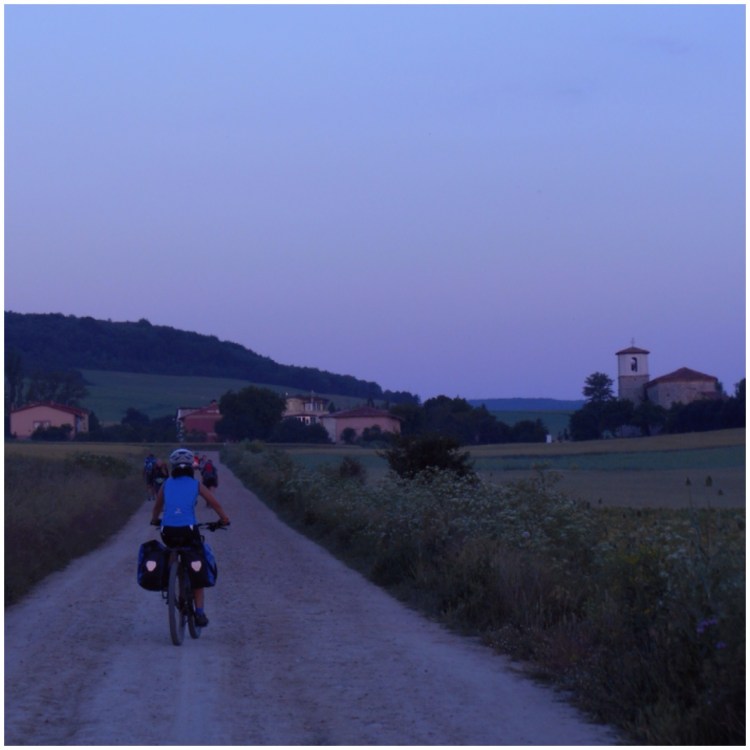 Hoy teníamos por delante dos retos importantes, las subidas de los Montes de Oca y del Alto de Atapuerca. Siguiendo la máxima de Einstein «Si quieres resultados diferentes no hagas siempre lo mismo», hemos cambiado de táctica para evitar pasar el calor de ayer. Nos hemos levantado a las 5.15 y a las 6 estábamos ya en marcha. Aún no había amanecido y teníamos que alumbrarnos con las frontales pero enseguida ha clareado y, mientras circulábamos entre Belorado y Tosantos, el sol ha aparecido a nuestra espalda, regalándonos este bonito amanecer.
