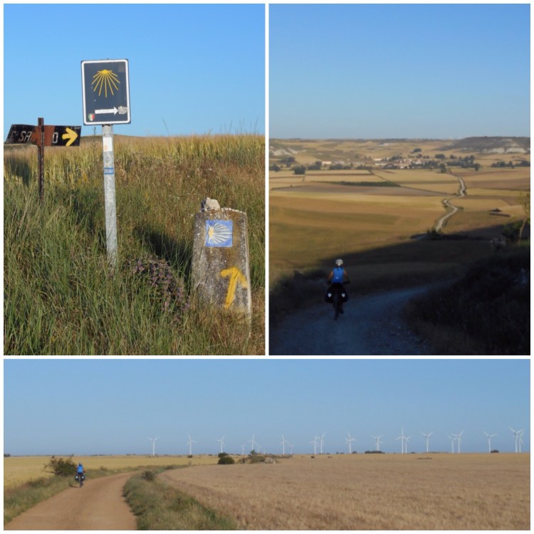 Larguísima etapa a través de los páramos de Castilla. Salimos de nuevo muy temprano para intentar aprovechar las horas más frescas del día aunque al final hemos estado pedaleando las frescas y las no frescas porque hemos llegado al destino a las cinco y media de la tarde. Afortunadamente todo el día ha soplado una ligera brisa, suficiente para hacer soportable el calor pero no tan fuerte como para afectar a la marcha en bici. Por cierto, la noche anterior era la de inicio de las fiestas de Burgos y toda la noche ha habido una juerga monumental por las calles alrededor del albergue (que está en la zona histórica, a 50 m de la Catedral). Así que he dormido a ratos (Blanca casi ni se ha enterado, no hay como ser joven). Al salir a las 6.30 de la mañana del Albergue todavía continuaba la juerga.