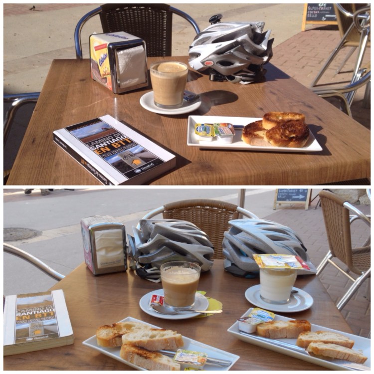 En Hontanas hemos parado a desayunar. Curiosamente es el mismo bar donde paré en mi Camino de 2013, ocupamos la misma mesa y pedimos prácticamente lo mismo. La foto de arriba es de 2013 y la de abajo es de hoy… Dejando de lado que en 2013 se les fue la mano tostando el pan, por lo demás nada ha cambiado. Hemos decidido que a partir de ahora será una tradición familiar parar en el Albergue El Puntido de Hontanas siempre que alguien pase por aquí.