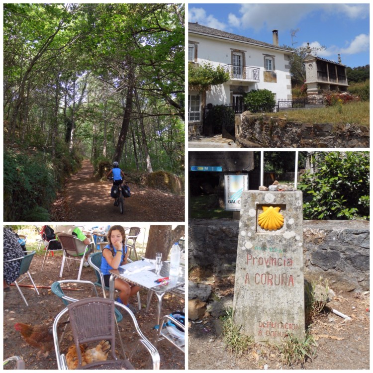 Y así, entre corredoiras, vamos avanzando hacia Santiago. El entorno es tan rural que cuando hemos parado a comer las gallinas picoteaban entre las mesas. Luego, poco antes de llegar a Melide, donde dormiremos, hemos pasado el límite entre la provincia de Lugo y la de Coruña.