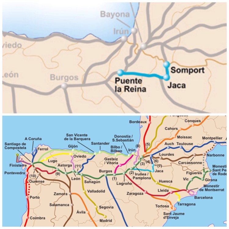 En este plano, cortesía de www.gronze.com, se ve el recorrido de esta variante desde el puerto de Somport hasta su enlace en Puente la Reina. Lógicamente en la antigüedad un camino no empezaba en un puerto de montaña ya que ahí no vivía nadie. Somport no es más que la entrada en la península de uno de los caminos principales que cruzan Francia, la Vía Tolosana o Camino de Arles, que a su vez recibe ramales desde otras zonas del Sur de Francia y desde Italia ¡hay una telaraña inimaginable de caminos que desde toda Europa nos dirigen a Santiago!