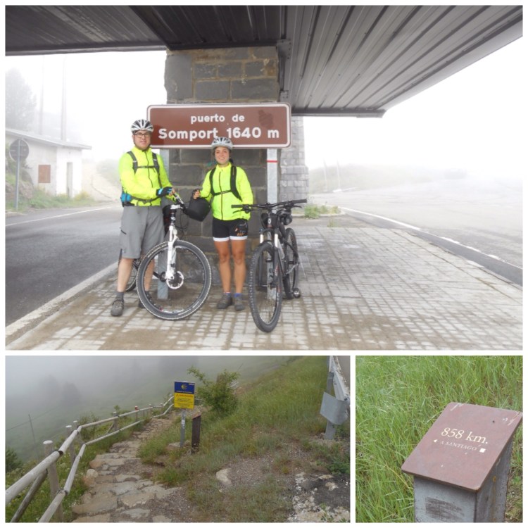 Con idea de recorrer los 165 km de la variante aragonesa hemos salido de casa a las 7 de la mañana en coche para llegar a Jaca a tiempo de coger el autobús que sube a Somport a las 12.30. Llegamos a las 11 con un amplio margen y después de preparar las bicis, vestirnos de ciclista y esperar desayunando en un bar, subimos por fin al autobús que en menos de media hora nos deja en lo alto del puerto (podéis consultar aquí el horario de los autobuses). Una foto junto al puesto fronterizo abandonado para dejar constancia del inicio del Camino y, entre la niebla, empezamos el descenso… por un tramo de escaleras. Esto será una constante en los primeros kilómetros del día, muchos tramos de sendero en pendiente han sido «reparados» poniendo escalones, para supuestamente facilitar la vida a los caminantes, pero dificultando el paso en bicicleta y, en mi opinión, haciéndolo menos natural y quitándole parte del encanto.