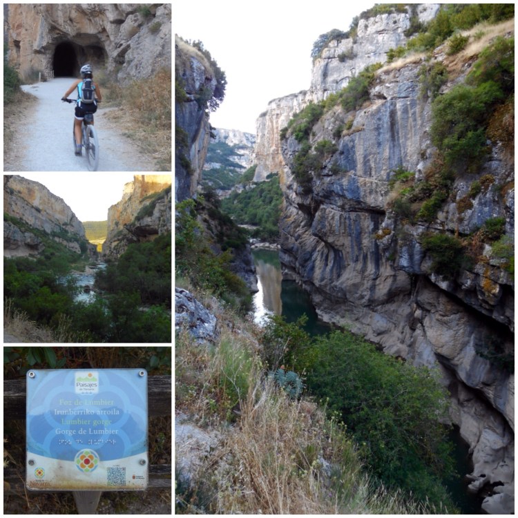 Como el día anterior, nos levantamos a las 6 y antes de las 7 ya estamos en marcha. Hoy nada más salir de Sangüesa nos desviamos del camino tradicional para seguir una variante que se está popularizando en los últimos años por el interés paisajístico de la zona que atraviesa, la Foz de Lumbier. Se trata de un cañón excavado por el río Irati que tiene la particularidad de ser recorrido por una vía verde, la plataforma de un antiguo ferrocarril reconvertido en ruta para bicicletas.