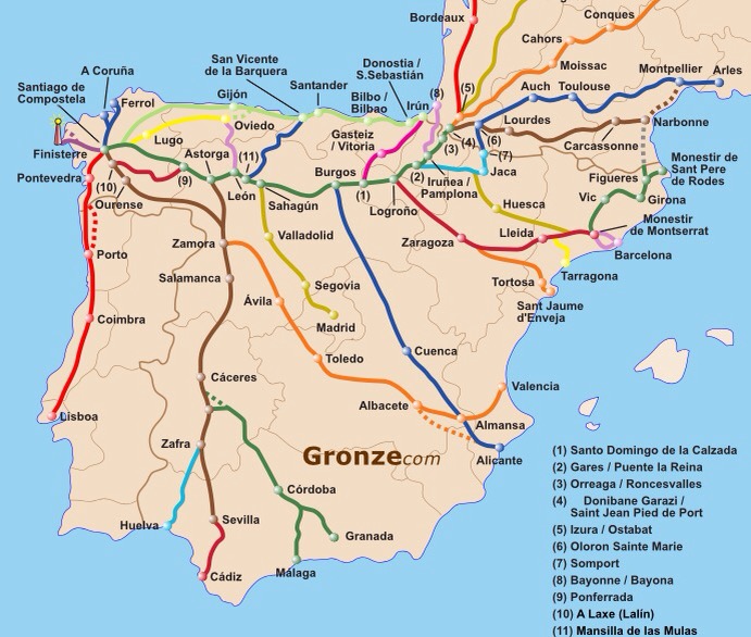 En este plano, cortesía de Gronze.com se puede ver el Camino Primitivo y su ubicación respecto al resto de Caminos a Santiago que cruzan la Península Ibérica. Es el de color amarillo que partiendo de Oviedo recorre el oriente asturiano, pasa por Lugo y se junta con el Francés (de color verde oscuro) en Melide, a unos 50 km al este de Santiago. El recorrido total desde Oviedo son aproximadamente 320 km.