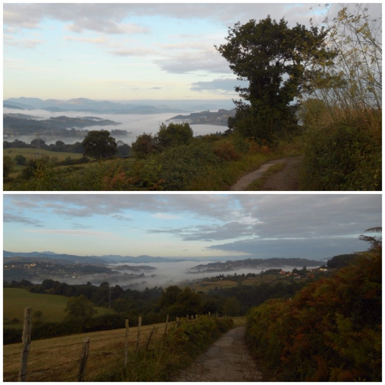 Poco después el Camino transcurre por la ladera de una montaña mientras un mar de nubes cubre el fondo del valle. El paisaje hace olvidar rápidamente el caos vivido en el centro de Oviedo.
