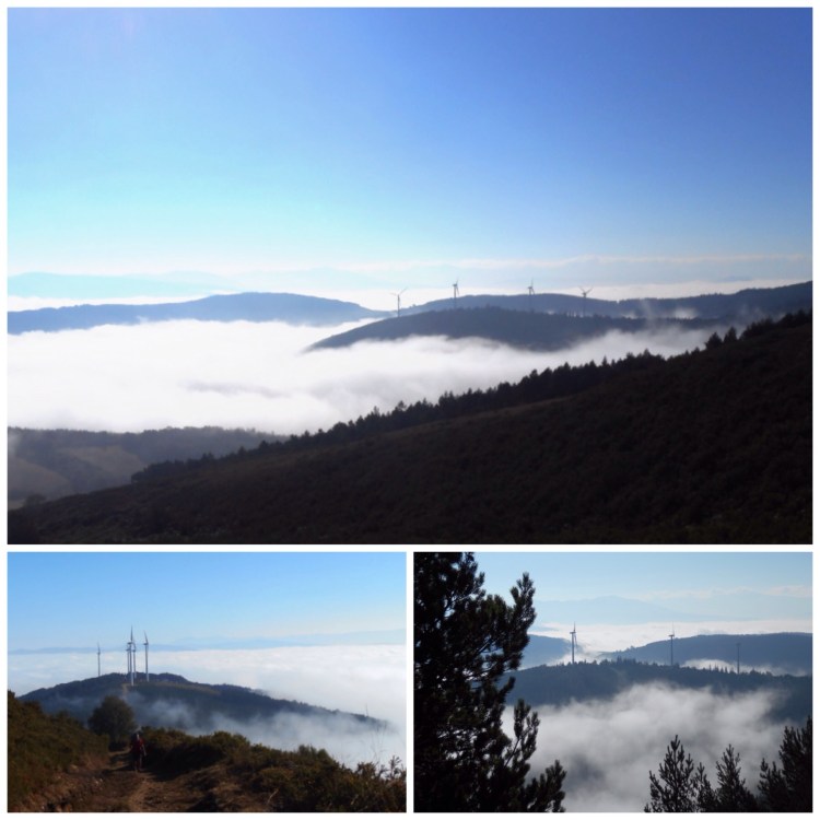 A partir de Peñafonte se inicia la ascensión al Puerto del Acebo, el que separa Asturias de Galicia. A medida que subimos vamos superando la línea de niebla y nos permite ver una preciosa estampa de los aerogeneradores en las cimas más altas sobresaliendo como islas del mar de nubes.