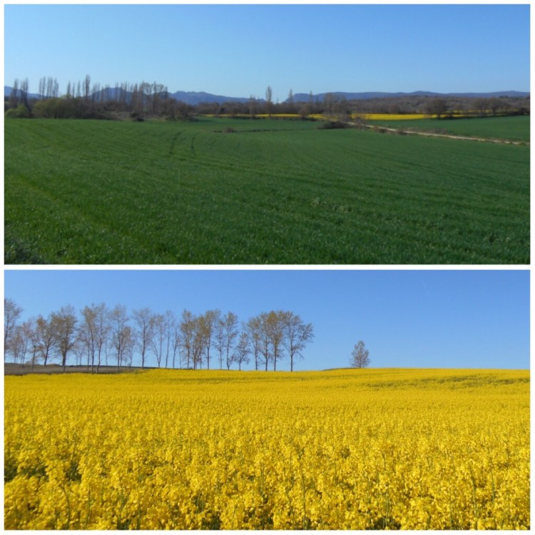 Desde que he entrado en Burgos el paisaje ha cambiado radicalmente respecto a los días anteriores. La montaña y sus pastos han dado paso a grandes extensiones de cereal, ofreciendo estampas tan bonitas como estos campos de colza rabiosamente amarillos.