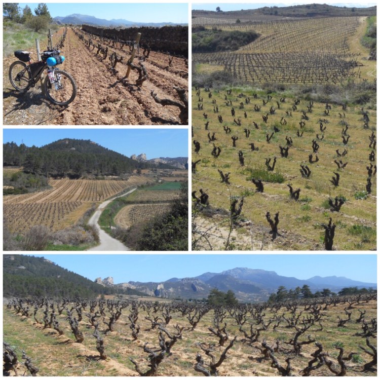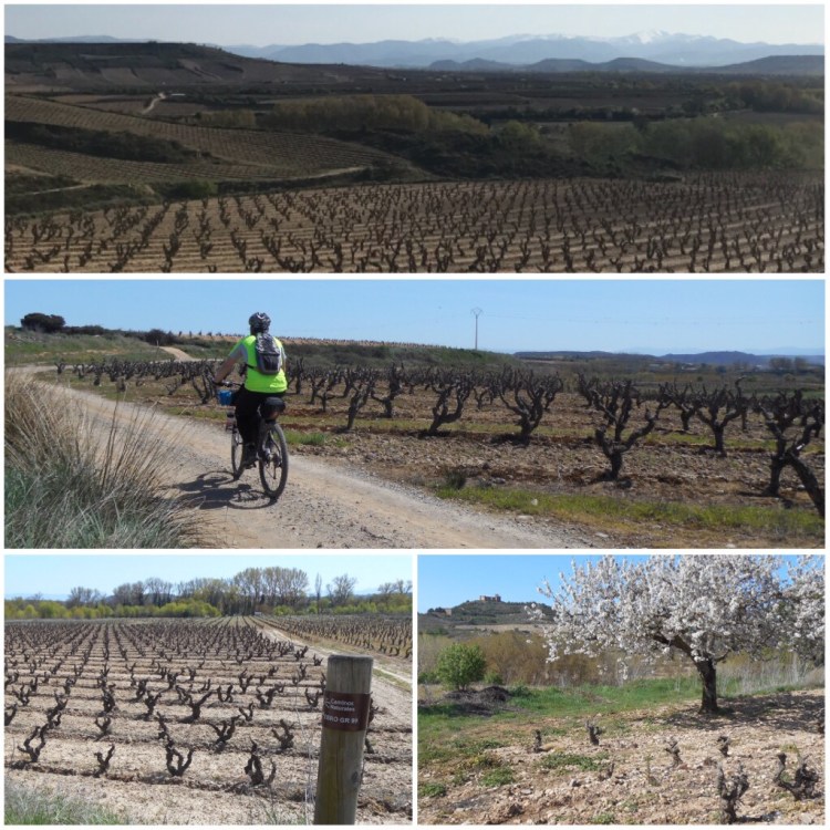 El resto del día ha sido espectacular. Cuarenta kilómetros de caminos agrícolas serpenteando entre viñedos. Viñas, viñas y mas viñas, hasta aburrirlas… Bueno, la verdad es que no me he aburrido, porque aunque sea un elemento tan simple, repetido miles de veces forma paisajes preciosos. No es una llanura, es un paisaje ondulado que no llega a hacerse monótono y que tiene como telón de fondo las montañas nevadas del Sistema Ibérico.