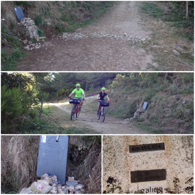 Empezamos a bajar por el otro lado y, de repente, una simple línea marcada con piedras en el suelo y una pequeña placa nos indican que salimos de Asturias y entramos en Galicia, en la provincia de Lugo. El primer mojón que vemos anuncia que faltan 165,974 km a Santiago.