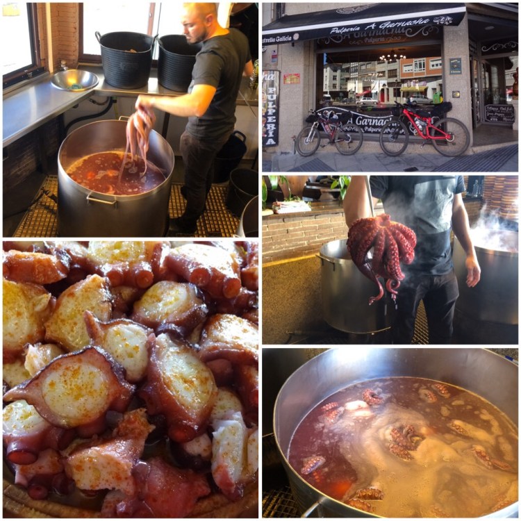 Y si esto es Melide, toca pulpo. Aquí se encuentra una institución del Camino de Santiago que es la pulpería Ezequiel. Abierta en 1960, es una de las pulperías más famosas de Galicia, no solo entre peregrinos y turistas sino entre los propios gallegos. De hecho, la propia gente de Melide tiene la costumbre de encargarlo y llevarlo para comer en casa, especialmente los domingos. Siguiendo la fama de Ezequiel se fueron abriendo otras pulperías en Melide y, de entre las «nuevas», aunque lleva más de 10 años abierta, la más famosa es A Garnacha. Hay debates sobre si es mejor el pulpo de Ezequiel o el de A Garnacha, pero lo mejor es no entrar en comparaciones absurdas y hacer como en mi anterior Camino Primitivo a pie y como hemos hecho hoy Pol y yo: comer en A Garnacha…