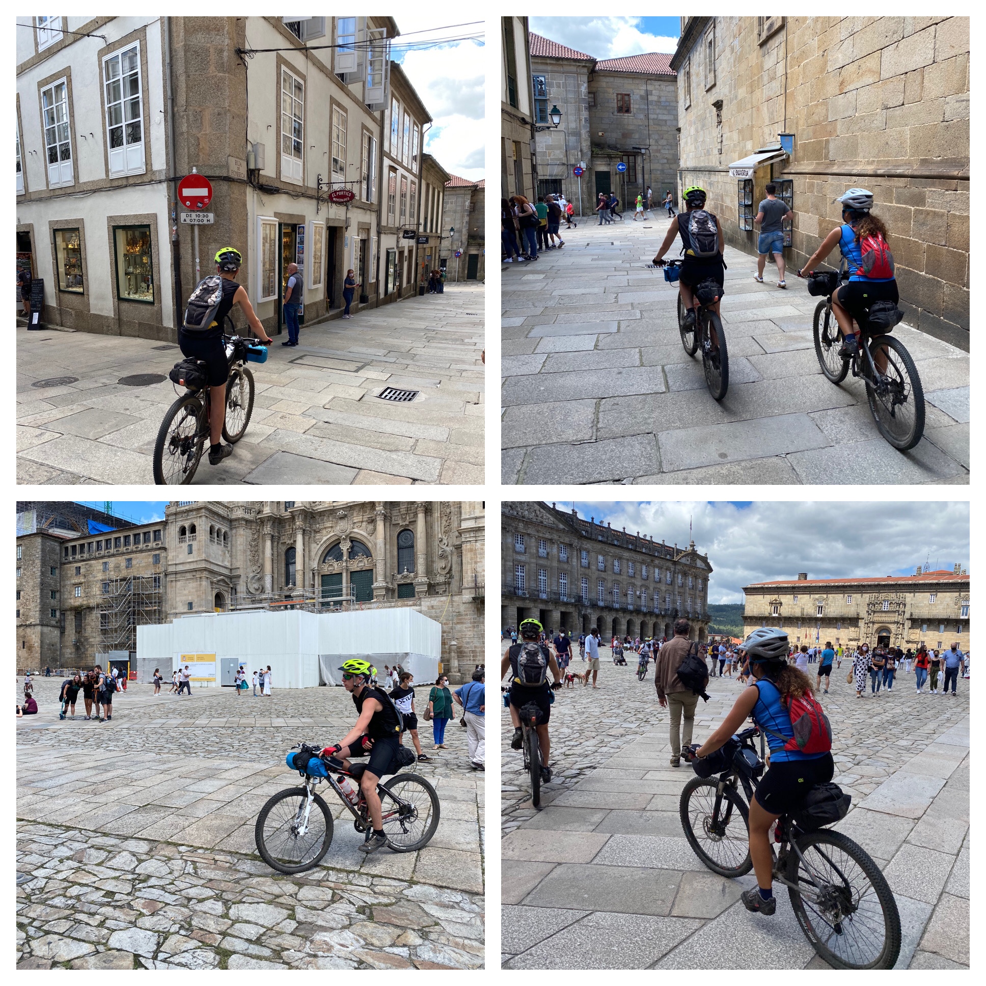 Por una calle en ascenso entramos por fin en la ciudad de Santiago, llegamos a su centro histórico y callejeando como podemos nos plantamos en la Plaza del Obradoiro, kilómetro cero de todos los Caminos de Santiago y final de este viaje.