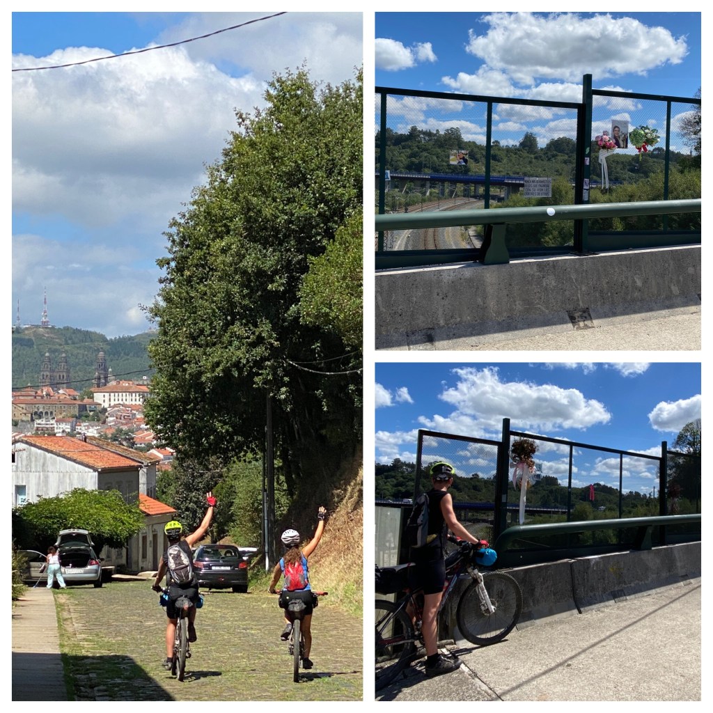Un momento emotivo y triste se produce cuando unos kilómetros antes de llegar a Santiago pasamos un puente sobre la vía del tren en la zona de Angrois, justo donde se produjo un trágico accidente ferroviario en julio de 2013 que costó la vida a 80 personas. En la valla del puente se han colocado flores, fotos y mensajes como recordatorio de las víctimas.
