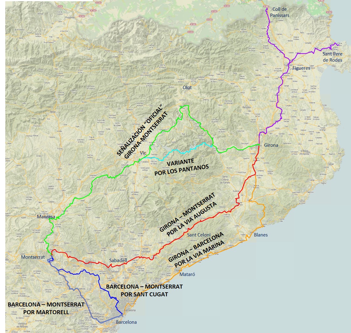 Una vez llegados a Girona, para continuar hacia Montserrat se nos presentan varias alternativas cuyos recorridos son muy diferentes. En primer lugar la opción más directa que pasa por Sant Celoni, Granollers y Sabadell y es conocida como la Vía Augusta por seguir el trazado de esta antigua calzada romana. Es la opción aparentemente más lógica y la más corta, unos 150 km de Girona a Montserrat, y ha sido señalizada y mantenida desde hace unos quince años por la asociación Gerunda (la muy activa asociación de amigos del Camí de Sant Jaume de Girona). La segunda opción es la Vía Marina de la Vía Augusta, una variante que se desvía de la primera en Riudellots de la Selva para dirigirse hacia la costa y llegar a Barcelona resiguiendo el litoral. Ya en época romana la Vía Augusta disponía de este ramal costero y por tanto tiene una base histórica. Su recuperación era un viejo anhelo de la asociación Gerunda y se ha culminado recientemente por lo que todavía es poco conocida. Esta Vía Marina termina en la ciudad de Barcelona así que para proseguir hacia Montserrat habría que continuar por cualquiera de los dos itinerarios señalizados entre la capital catalana y la abadía benedictina, el que va siguiendo el curso del Llobregat y pasa por Martorell o el que sale de Barcelona por Collserola pasando por el monasterio de Sant Cugat.