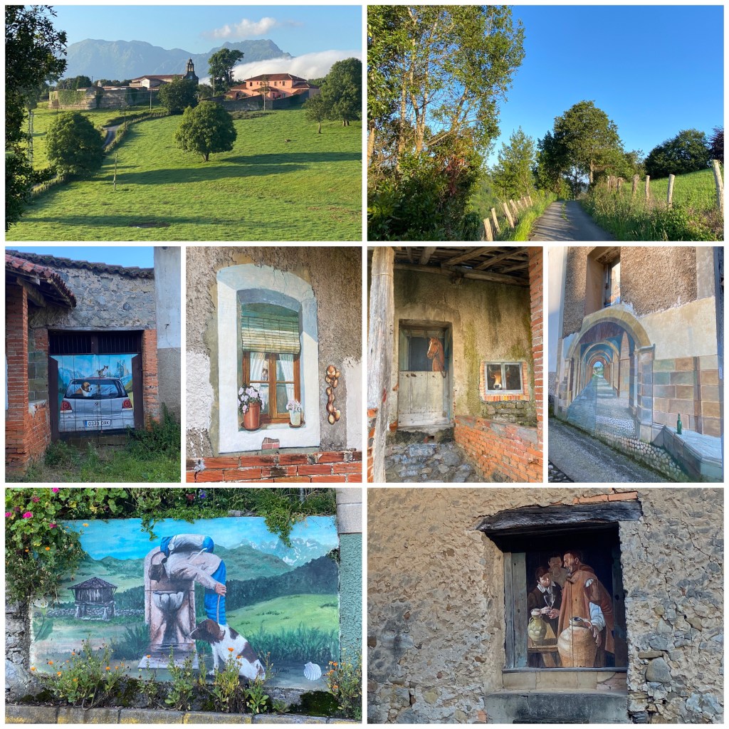 Fai un sol de carallo cantaban Os Resentidos en los 80. Y así es como ha amanecido hoy. Con ánimos renovados salgo del albergue de San Esteban de Leces para enseguida pasar por Vega de Ribadesella donde un artista local se ha dedicado a pintar curiosos trampantojos en algunas paredes del pueblo.