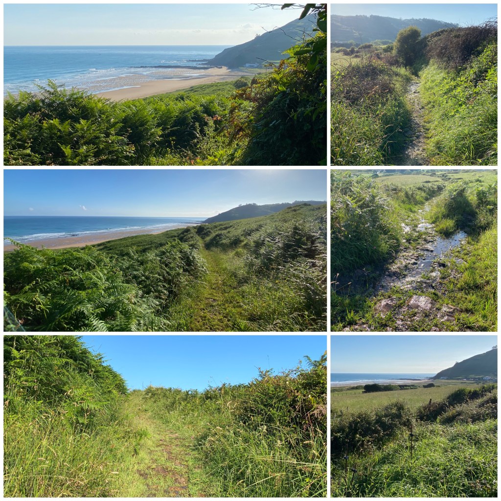 Desde aquí un precioso sendero va resiguiendo el litoral pasando por algunas pequeñas playas rocosas y siempre rodeados del verde de los pastos y los helechos. En este tramo he visto a lo lejos caminar a una peregrina a la que más tarde conocería.