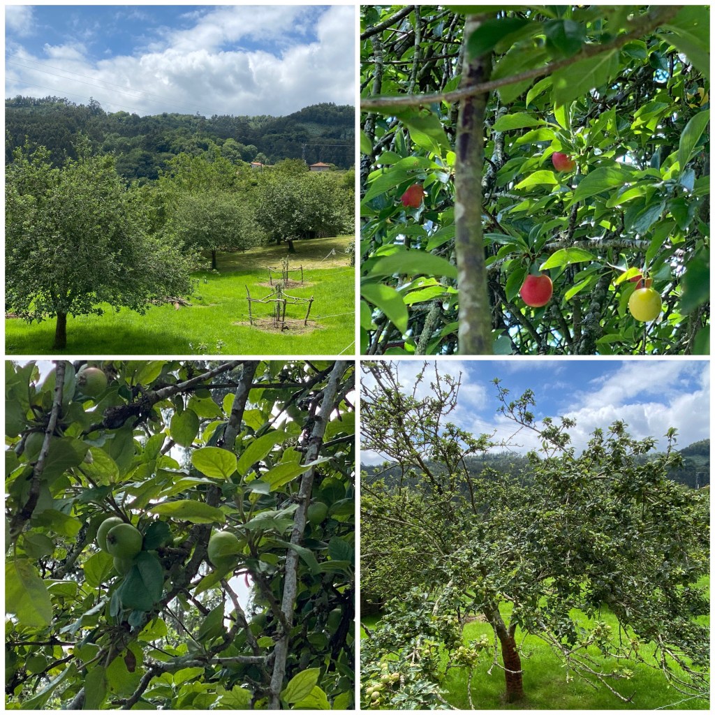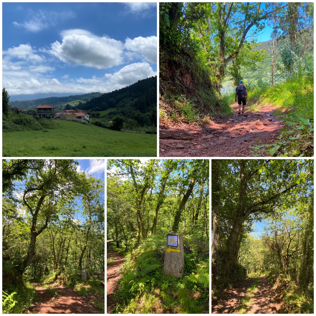 La mayoría del recorrido por esta comarca de la sidra se hace siguiendo la carretera local que va uniendo las pequeñas aldeas. Cuando en algún momento se abandona el asfalto se pasa por bonitos senderos entre árboles, algo embarrados por las lluvias de los días pasados
