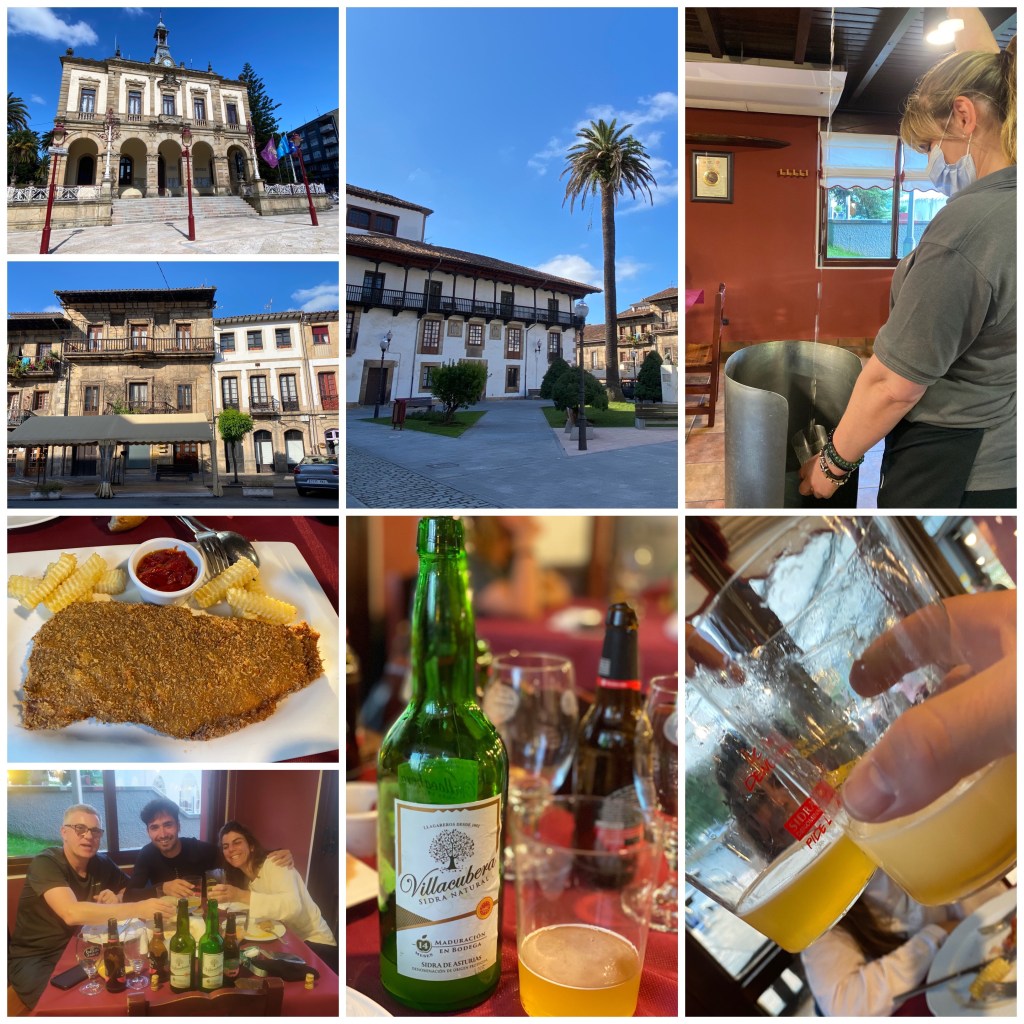 Más tarde me encuentro con Ana, la chica que había visto unas horas antes al principio de la etapa, y un poco más adelante coincidimos con Alberto. Juntos recorremos los kilómetros que quedan hasta Villaviciosa. A medida que nos acercamos se atraviesan algunas pumaradas y se pasa cerca de la fábrica de sidra El Gaitero. Entramos por fin en la población donde en cuanto llegamos al centro paramos a tomar unas cervezas.
