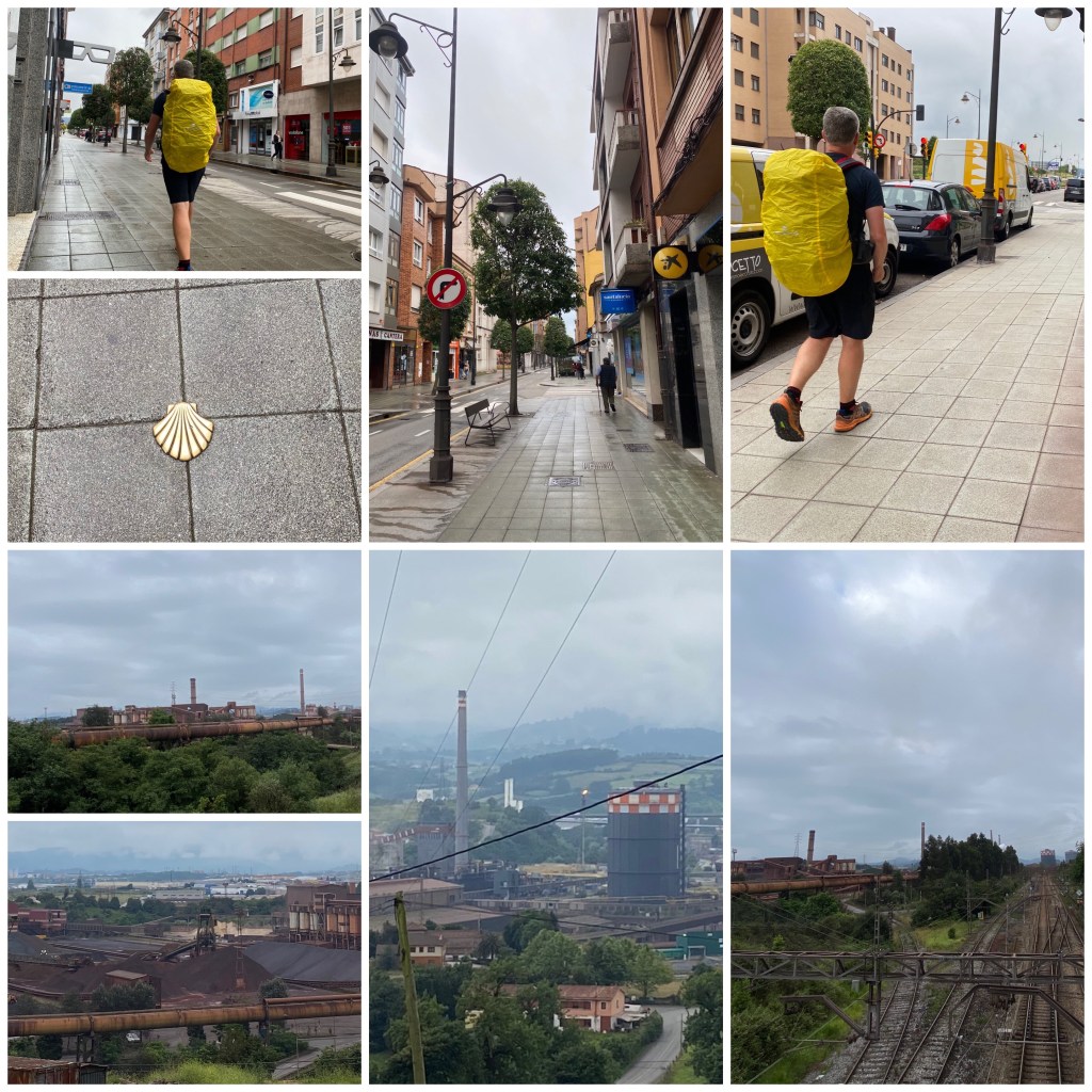 Los primeros cinco kilómetros del día son una larga travesía urbana por las calles de Gijón, conectando calles y avenidas prácticamente en línea recta. No tienen nada de especial y se hace un poco pesado, pero cuando acaba el casco urbano los siguientes dos kilómetros son como salir del fuego para caer en las brasas, ya que atravesamos una zona muy degradada de industrias pesadas por un paisaje casi apocalíptico.
