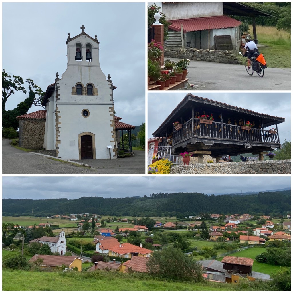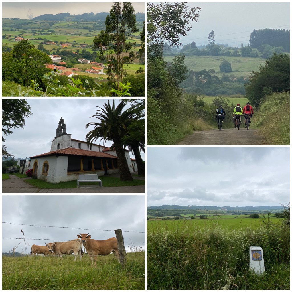 En este tramo he adelantado tres peregrinos ciclistas que estaban parados arreglando un pinchazo. Luego me adelantarían justo cuando llegaba a Santiago del Monte, un pequeño núcleo con una ermita en la que paro a comerme unas galletas que he comprado en Avilés, ¡hoy me hubiera venido bien tener mi bici!