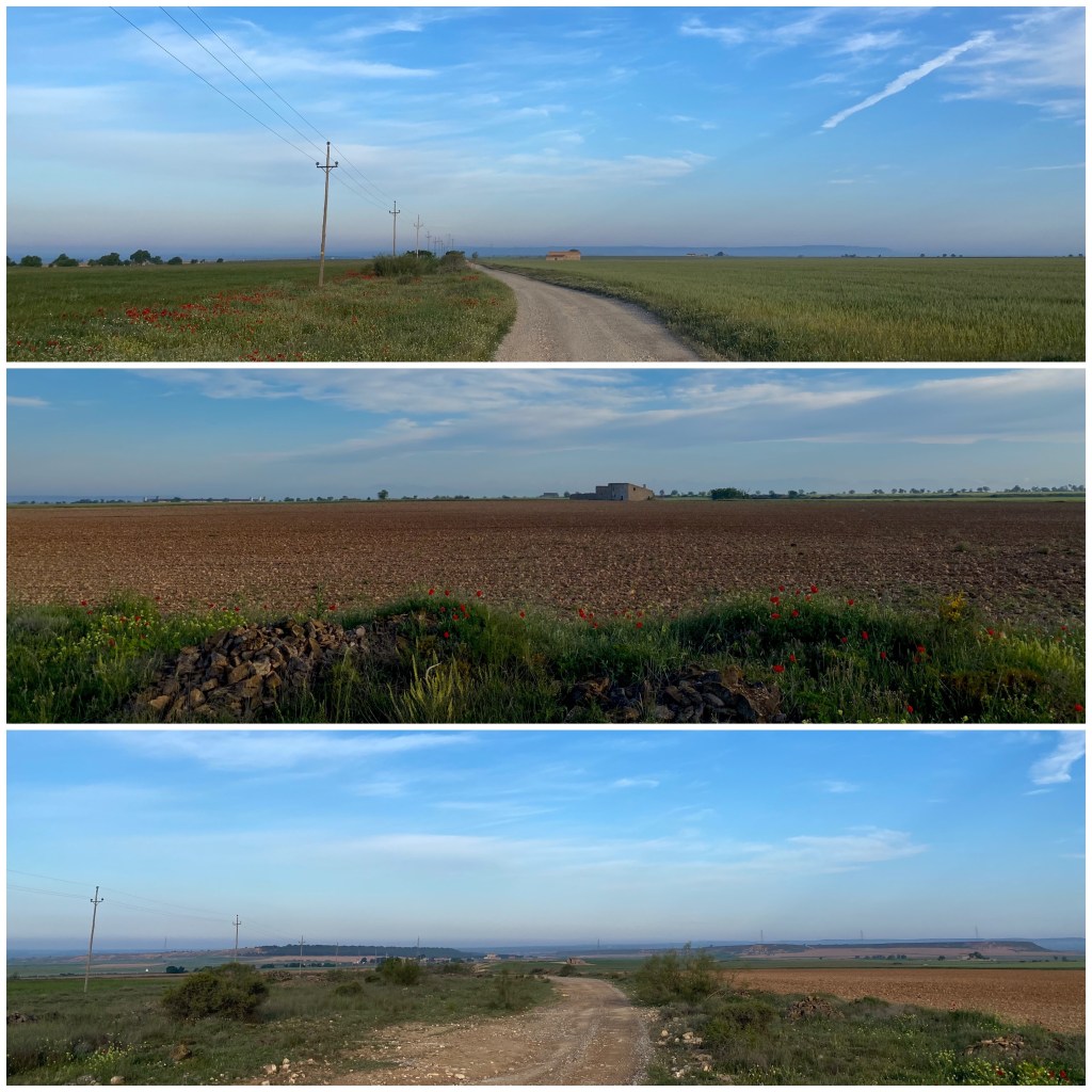 En realidad en la comarca estricta de Los Monegros no entraría hasta más tarde pero la zona que empiezo a recorrer comparte el mismo clima y el mismo paisaje. Una tierra árida, dura, seca y de amplios horizontes. En cierta medida recuerda al páramo de la Meseta en las provincias de León y Palencia que se atraviesan en el Camino Francés. De vez en cuando aparece alguna mancha verde allí donde llega el riego y se puede cultivar maíz.