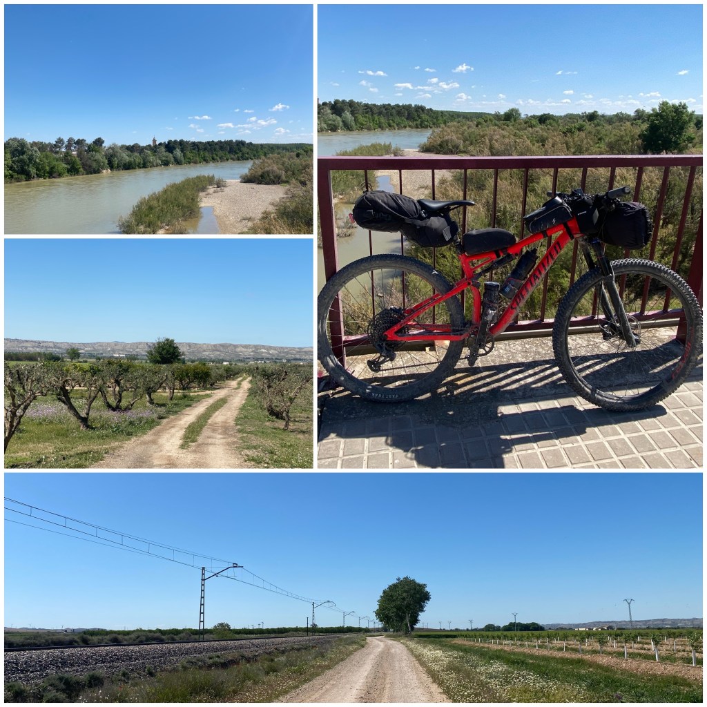 Esperaba inocentemente que una vez en el valle el cierzo quizás no soplara tan fuerte como en Los Monegros pero no solo no ha disminuido sino que ha ido cada vez a más. Aún así decido avanzar de momento e ir viendo, por lo que salgo de Pina cruzando el río Ebro y continúo la ruta. En los siguientes kilómetros ha habido varios tramos en los que se circulaba junto a las vías del tren. En general todo está mucho más verde que en Los Monegros y hay más zonas cultivadas.