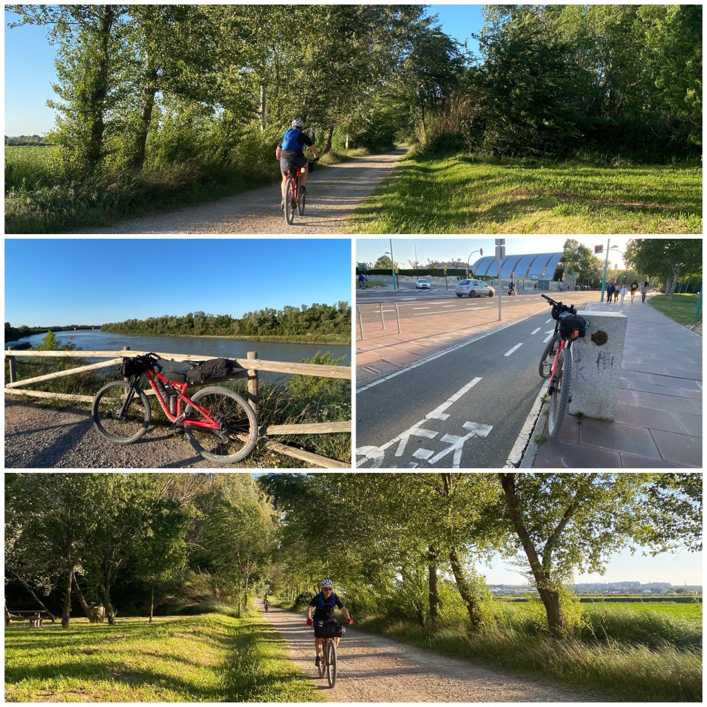 Parando al final cada pocos kilómetros he conseguido llegar a Zaragoza. La entrada a la ciudad está muy bien resuelta. Habitualmente en los Caminos de Santiago las entradas y salidas de las grandes ciudades son problemáticas porque hay que pasar por zonas industriales, barrios periféricos sin demasiado encanto e infraestructuras de todo tipo como autovías, vías de tren, anillos de circunvalación, etcétera. En Zaragoza se entra por un camino junto al Ebro que en cuanto empiezan los edificios de la ciudad se transforma en un parque urbano con un magnífico carril bici que en dos kilómetros me lleva a la mismísima plaza del Pilar.