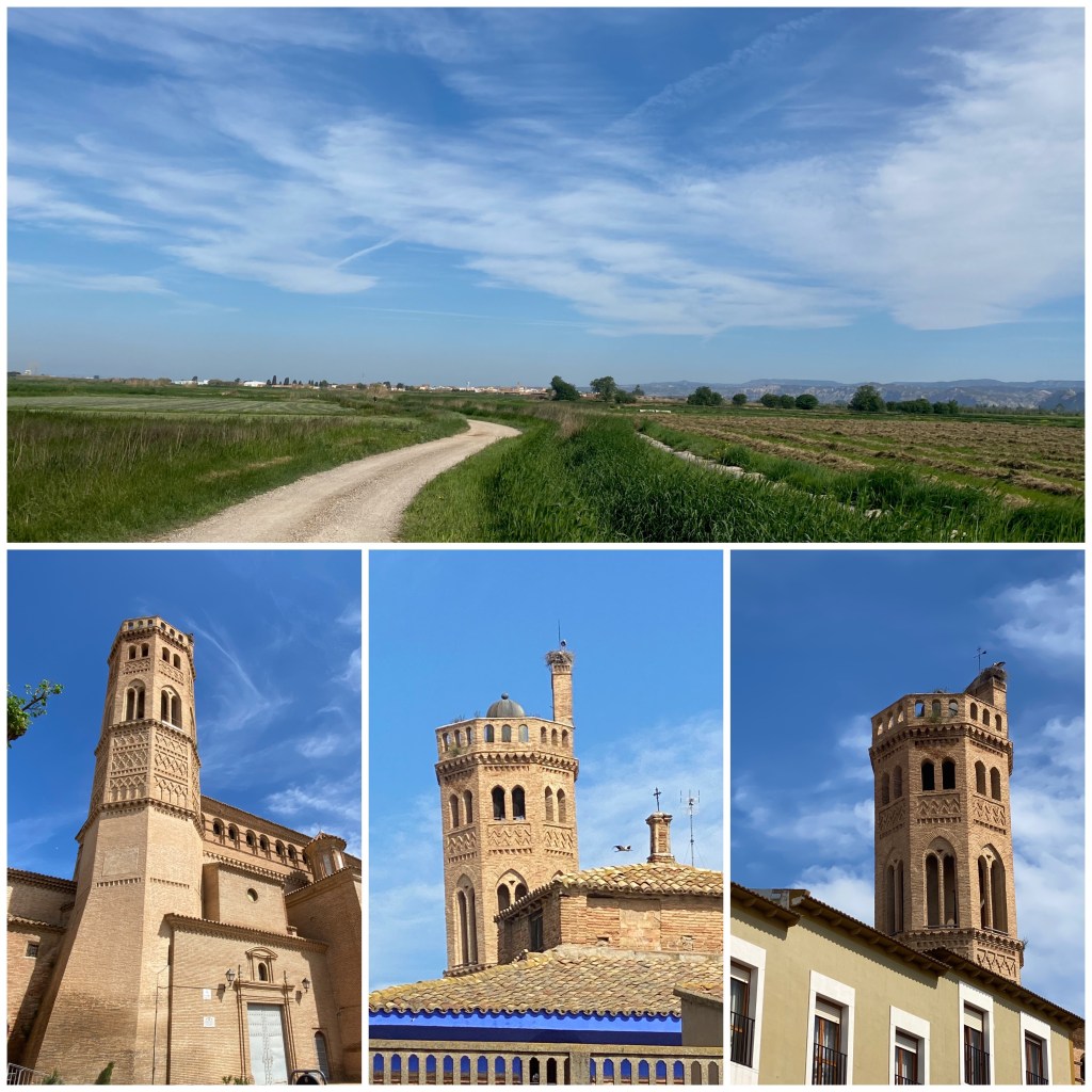 Siempre entre los campos de la fértil vega del Ebro llego a Alagón dónde paro a desayunar. La torre de su iglesia de San Pedro Apóstol es otro ejemplo de estilo mudéjar que además era originariamente el minarete de la mezquita que hubo aquí en tiempos de la dominación musulmana.