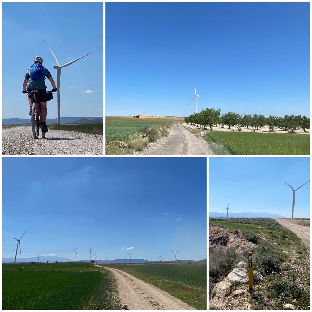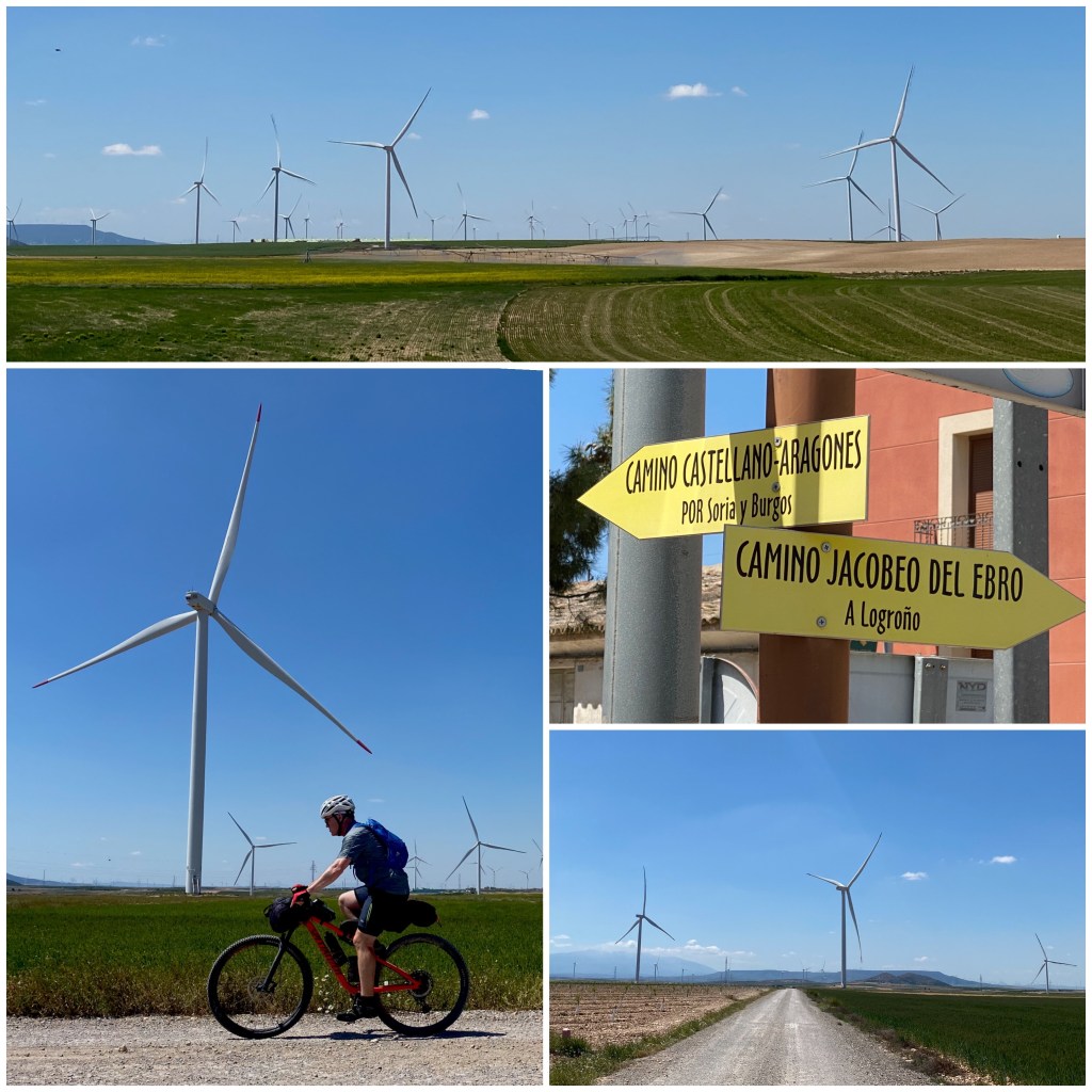 Parto de Gallur siguiendo las marcas del Camino Castellano-Aragonés por una pista entre campos sembrados y decenas de aerogeneradores. Hay muchísimos. Y después de dos días soportando el cierzo, el viento de la zona, se entiende porque no ha sido necesario instalarlos en la cima de un monte como en tantos otros lugares.