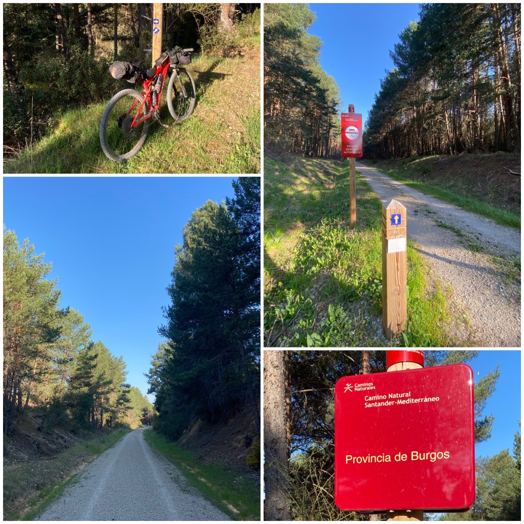 A la salida de San Leonardo de Yagüe se toma la misma vía verde Santander-Mediterráneo que ayer me condujo hasta aquí. Pero en la dirección hacia la que voy solo están acondicionados seis o siete kilómetros, luego viene un tramo en el que aún no se han desmantelado las vías y las traviesas y no ha sido reconvertido en vía verde. De hecho antes del final, a los cuatro kilómetros y medio, la señalización del Camino Castellano-Aragonés ya me saca de la vía verde para tomar una pista. Poco antes he pasado el límite entre las provincias de Soria y Burgos.