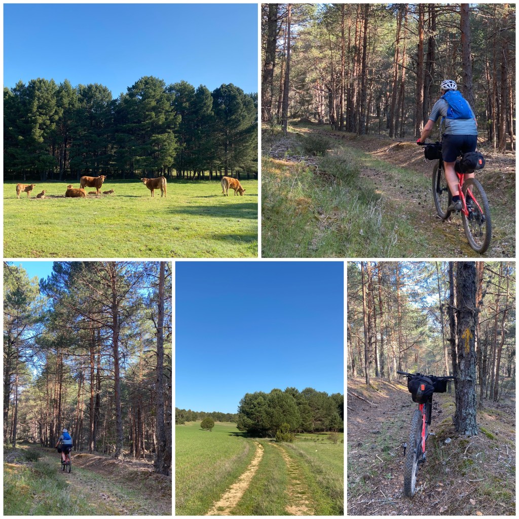 Por un camino voy atravesando la Sierra de la Demanda cruzando un bosque de altísimos pinos solo interrumpido de vez en cuando por el paso a través de algunos pastos ganaderos.
