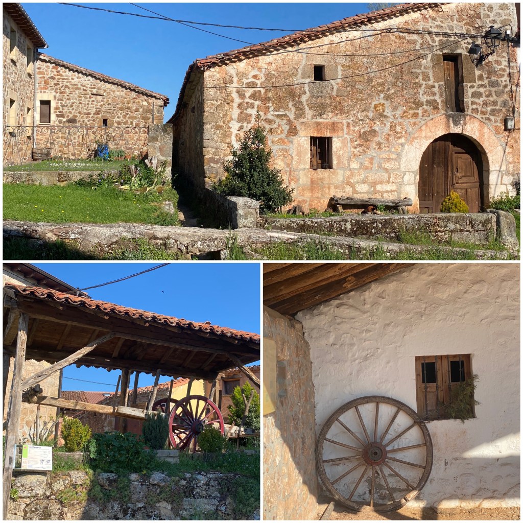 Al final el camino sale del bosque y desemboca en una carretera asfaltada que en menos de dos kilómetros me lleva a Aldea del Pinar, un pueblecito con algunas casas de piedra tradicionales bien conservadas que por lo visto fue durante siglos un centro reputado de construcción de carretas, cuando eran el medio de transporte dominante.