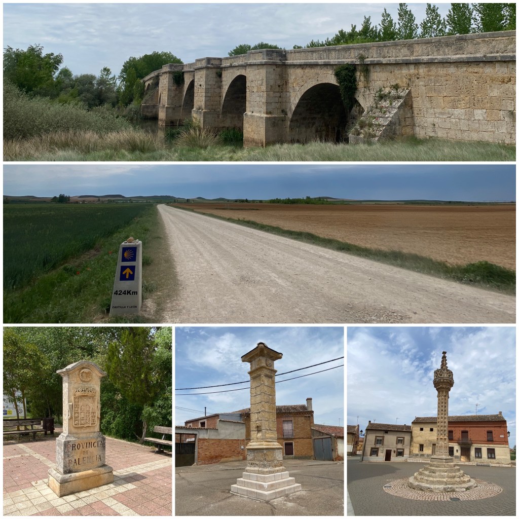 En cuanto llego de nuevo al llano cruzo el río Pisuerga por el largo Puente Fitero, de once arcos y edificado en el siglo XI, que marca el límite entre las provincias de Burgos y Palencia. Antiguamente representaba la frontera entre los reinos de Castilla y de León. Después, siempre atravesando esta enorme llanura cerealística, paso por Itero de la Vega y Boadilla del Camino. En ambas poblaciones se conservan “rollos de justicia”, una especie de columna que era un símbolo de la autonomía jurisdiccional que poseía el pueblo y también el lugar donde se ataba a los condenados para ser expuestos a la vergüenza pública.