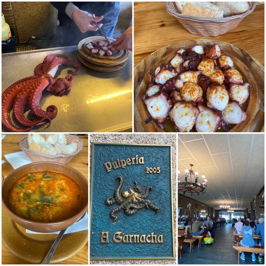 Pocos kilómetros antes de Melide empieza a llover. Son estas situaciones en las que para lo poco que queda vas tirando y tirando sin parar a ponerte la ropa impermeable esperando que sea solo una lluvia ligera y haya tiempo de llegar al destino y cuando te das cuenta estás empapado. Nada más llegar me recupero con un caldo gallego caliente y un plato de pulpo en A Garnacha, la segunda pulpería más famosa de Melide. Y para terminar café de puchero con unas gotitas de orujo, más gallego imposible…