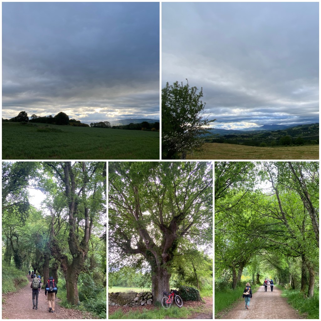 En algunos momentos había realmente mucha gente. Cuando se va en bicicleta a los peregrinos a pie se los va encontrando por oleadas. Durante una hora o dos se adelantan caminantes aislados y de repente en la hora siguiente se coincide con una multitud que no acaba nunca hasta que desaparecen de nuevo un par de horas y vuelta a empezar. Esto ocurre porque hay unos fines de etapa típicos que aparecen en todas las guías y donde duerme la mayoría de gente. Los peregrinos que salen de uno de esos lugares lo hacen más o menos a la vez, con una diferencia de quizás una hora arriba o abajo, y caminan, en general, a velocidades muy similares, por eso van “en caravana” y cuando en bicicleta se les alcanza se ha de pasar a todo el grueso de los que han partido de un mismo pueblo esa mañana. Luego hay una franja con menos gente hasta que se atrapa a los que han iniciado la etapa en otro punto y así todo el día. Hoy agradecía los tramos en los que el Camino iba paralelo a una carretera porque era donde era más fácil adelantar las “oleadas”.