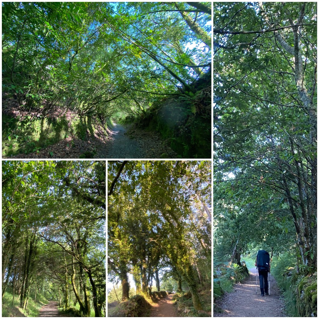 Los siguientes diez kilómetros discurren mayoritariamente por senderos a través de robledales “contaminados” con los inevitables eucaliptos. Subiendo y bajando constantemente llego a Vilaserío, donde paro a tomar un café.