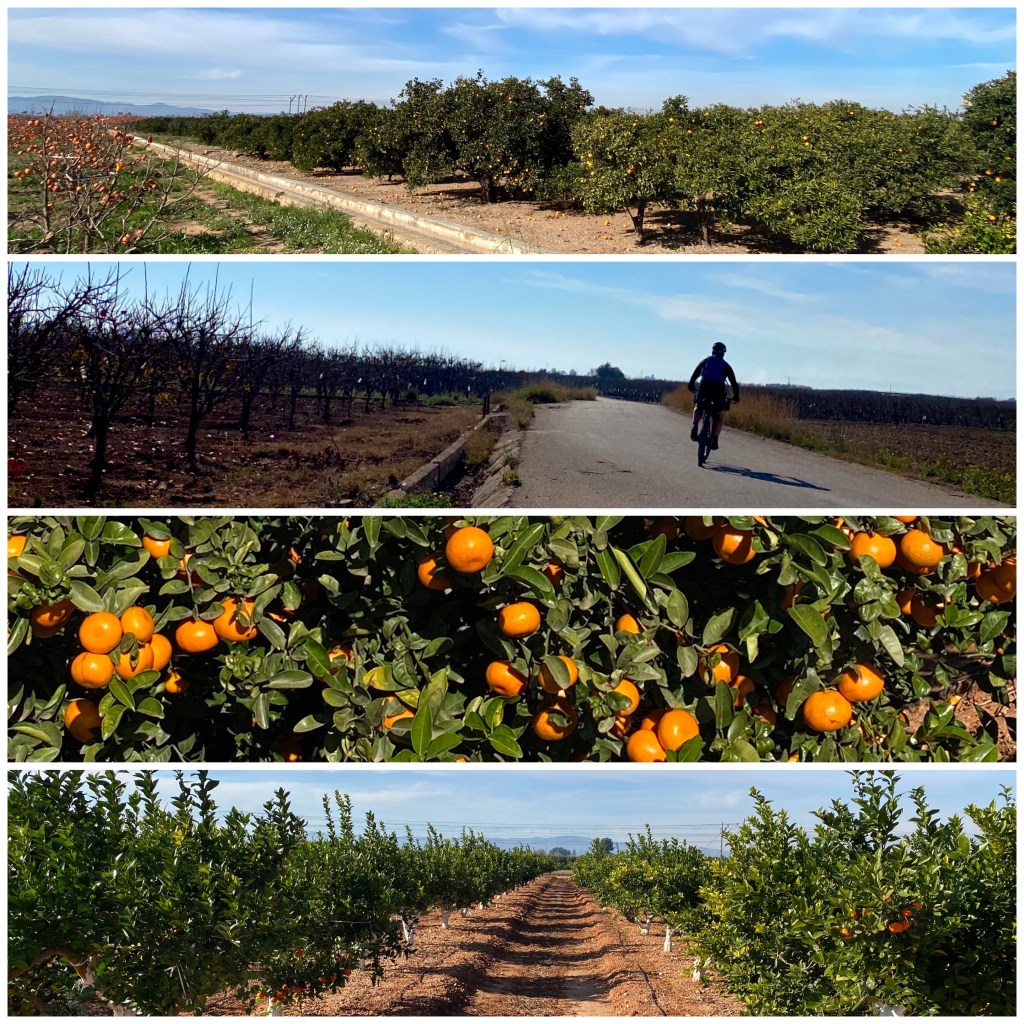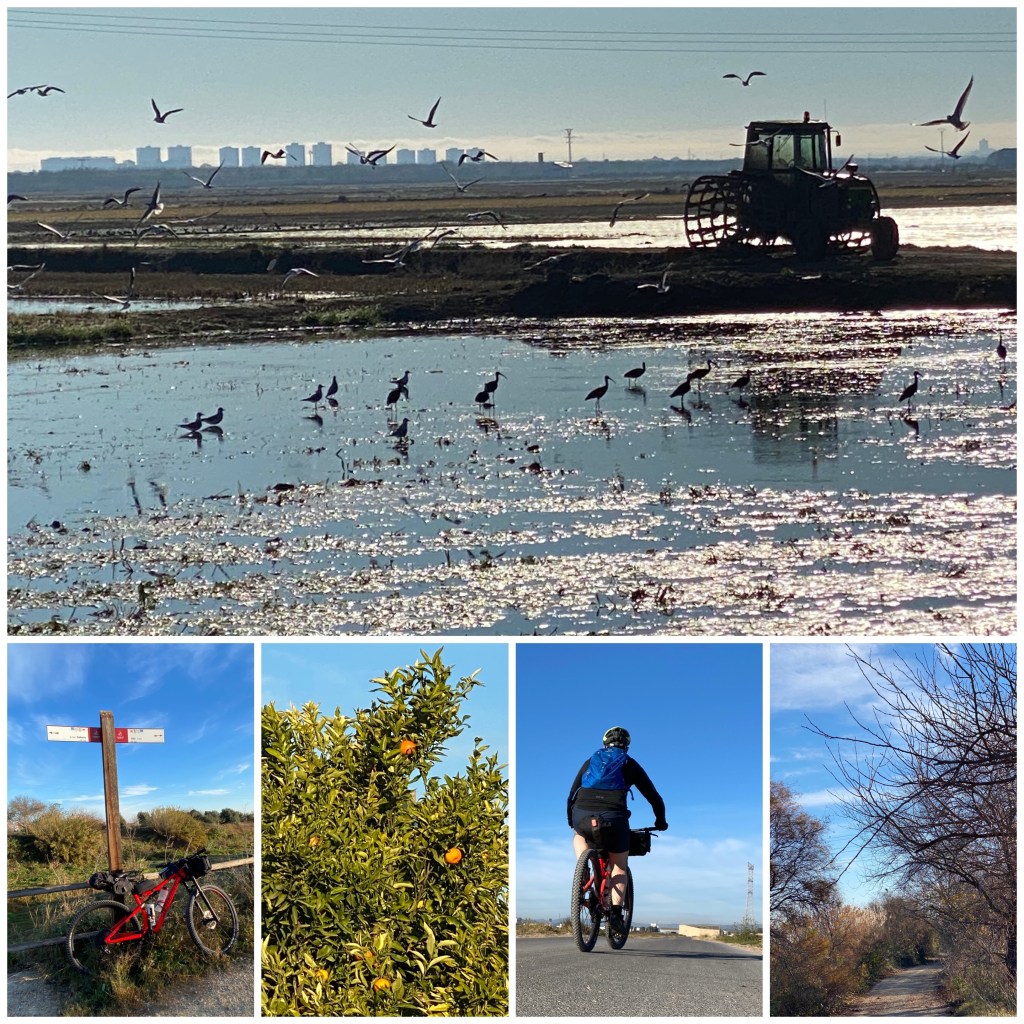Durante los aproximadamente veinte kilómetros siguientes atravieso la Albufera por pistas agrícolas mayoritariamente asfaltadas que circulan entre campos de arroz inundados y plantaciones de naranjas y caquis.