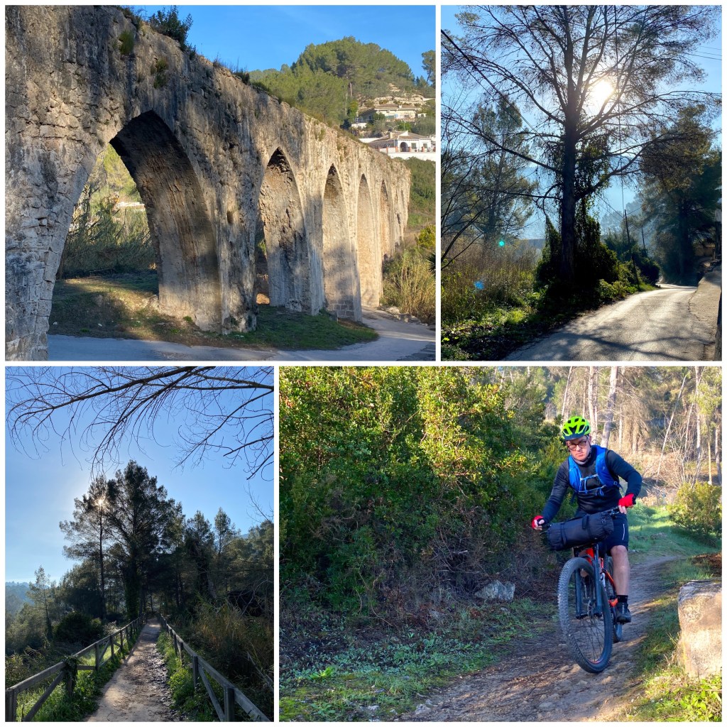 El día empieza con un kilómetro de dura subida a la salida de Xàtiva recompensado con un descenso aún más largo por el lado contrario. El paisaje ha cambiado completamente respecto a la jornada anterior. Han desaparecido la huerta y los naranjales y ahora predomina el bosque mediterráneo dominado por pinares. Pronto se pasa por las Arcadetes d’Alboi, un pequeño acueducto del siglo XI muy bien conservado que abastecía de agua antiguamente a la ciudad de Xàtiva.