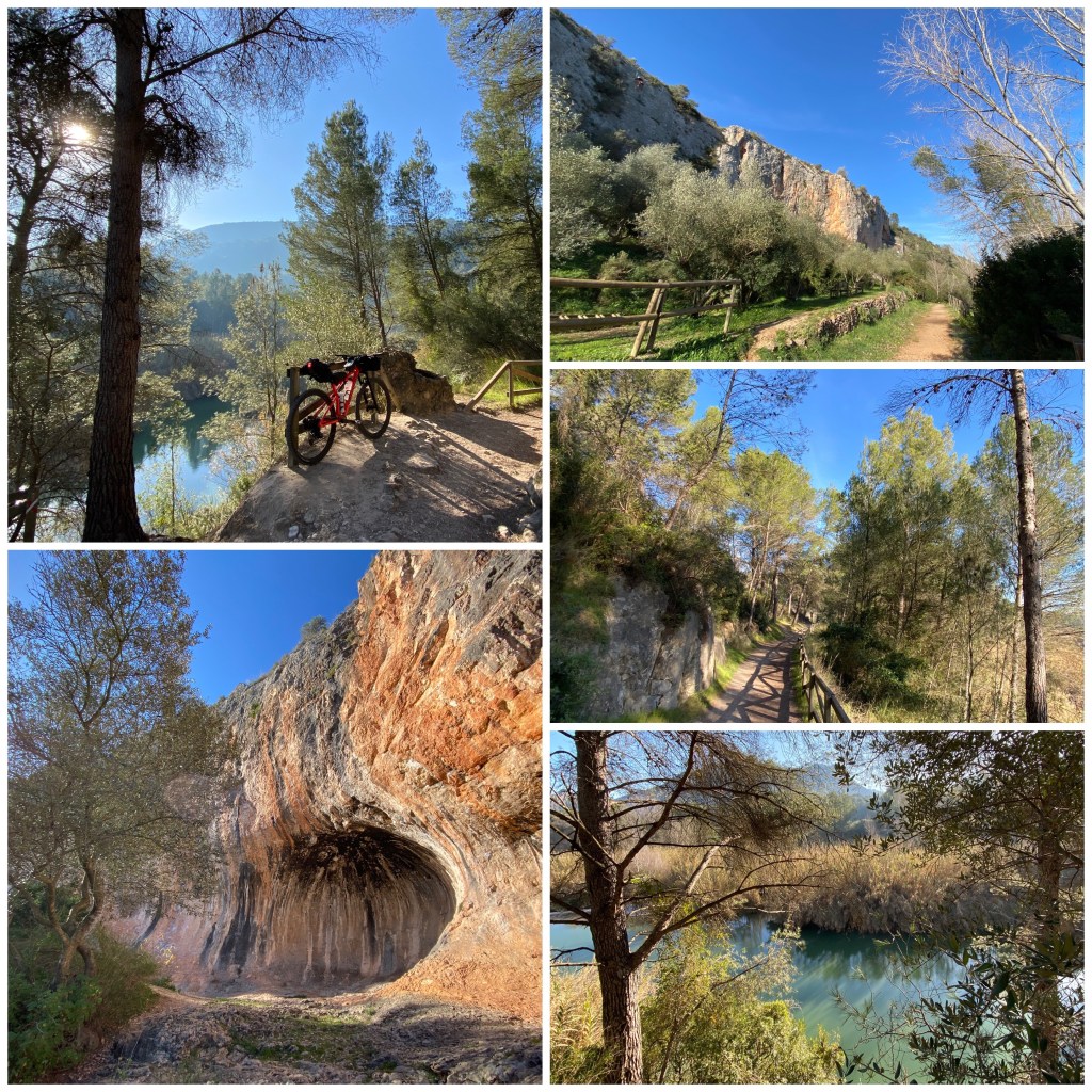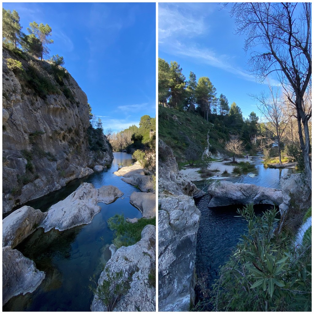 Pasado Ontinyent se inicia uno de los tramos más bonitos de todo este camino. Primero, a pocos kilómetros de Ontinyent, se pasa por la zona del Pou Clar, una serie de pozas naturales excavadas por el río en la roca caliza y en las que a pesar de estar en pleno invierno, ya que hoy es 3 de enero, y dado que las temperaturas son bastante más elevadas de lo que tocaría para la época, hay algunas personas bañándose.