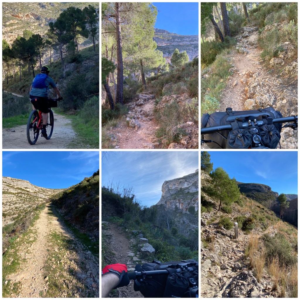 Después empieza el tramo más duro de toda la ruta “La defensa del Sur”. Se trata de una zona de montaña que forma parte de las Cordilleras Béticas y que se atraviesa por el conocido como Barranc dels Tarongers, un desfiladero excavado en la roca. Es un sendero estrecho, pedregoso y en ascenso en el que gran parte del tiempo hay que bajarse y empujar la bici. La parte más complicada son poco más de dos kilómetros.
