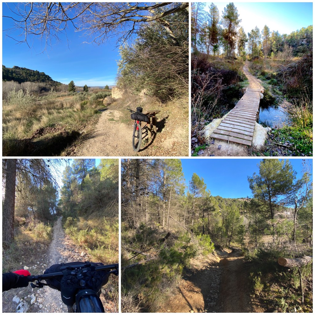Tras descender de Banyeres inicio una larga travesía por las estribaciones de la Sierra de Mariola. Primero cruzo una zona recreativa a orillas del río Vinalopó, que nace en varias fuentes cerca de aquí, y a continuación asciendo por un tramo de sendero empinado y rocoso en el que hay que arrastrar un poco la bici y que finalmente desemboca en una pista forestal.