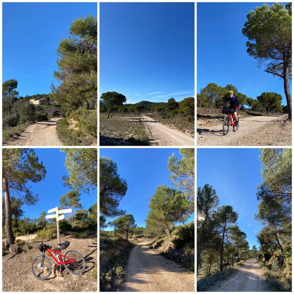 Por esta pista entre pinares se avanza por la Sierra de Mariola en subida constante aunque suave hasta llegar a un punto a una altitud de 927 metros que es el más alto de toda la ruta entre Valencia y Orihuela. A partir de ahí la pista desciende durante varios kilómetros hasta Biar.