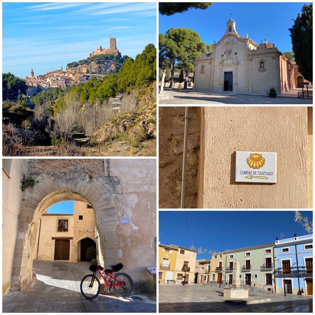 Antes de entrar en la población se pasa por el Santuario de Nuestra Señora de Gracia y poco después ya se divisan las casas apiñadas alrededor de un cerro presidido por un castillo, una vez más la disposición típica que denota claramente los orígenes árabes de la localidad. En Biar paro a desayunar en un bar y justo enfrente veo una señal de Camino de Santiago. Luego averiguaría que por aquí pasa un ramal del Camino del Sureste procedente de Benidorm y que en Villena enlaza con el tronco principal que se inicia en la ciudad de Alicante.