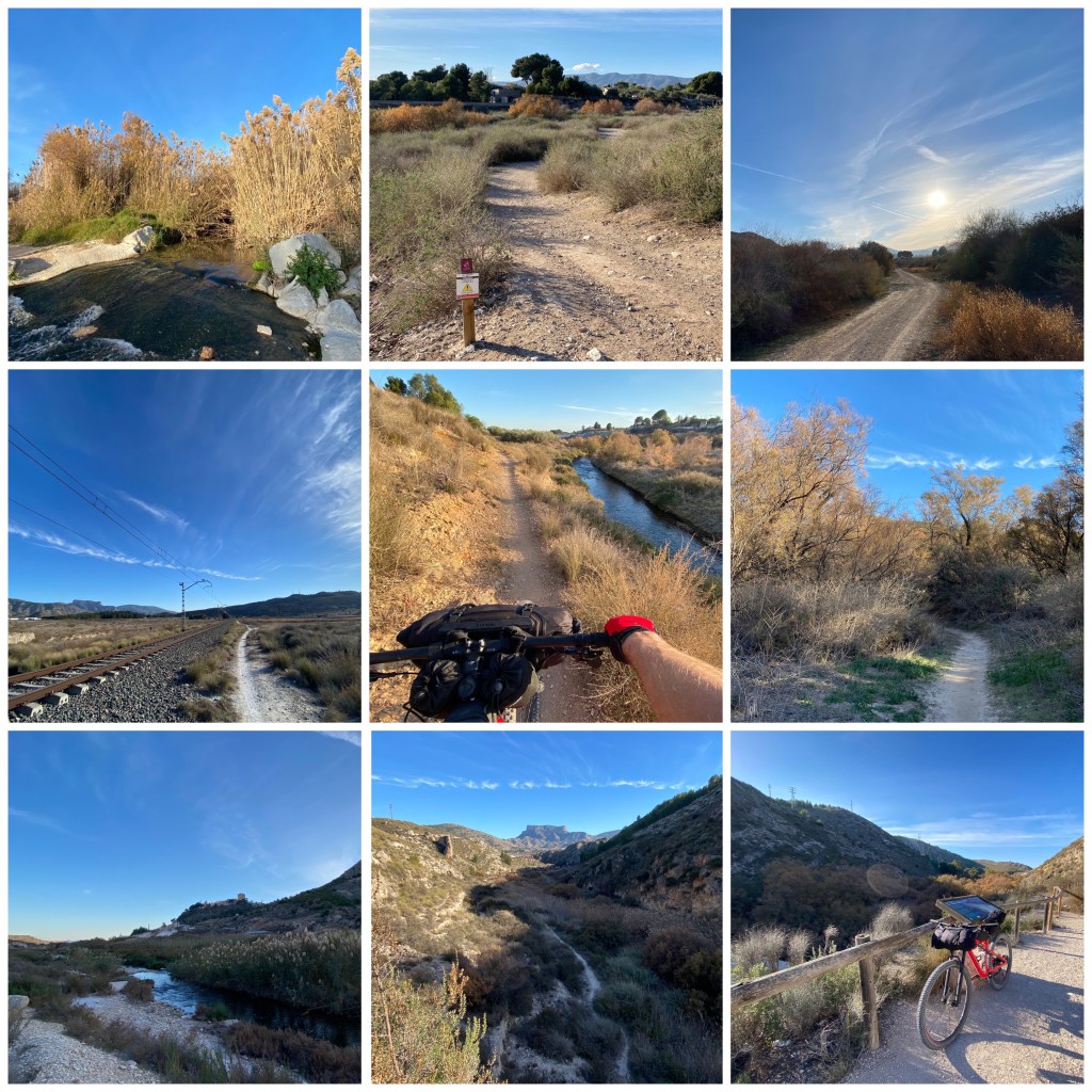 Precisamente en Sax se cruza por un puente sobre el río Vinalopo cuya orilla ya no abandonaré durante el resto de la jornada. Hay un tramo particularmente bonito en el que por un sendero por el propio curso del río, que está completamente seco, se circula entre vegetación de ribera. Posteriormente se pasa junto a los restos de una antigua presa del siglo XVII. Sin abandonar el río cruzo Elda siguiendo su paseo fluvial y siempre avanzando por pistas y senderos próximos al cauce recorro los últimos doce kilómetros hasta Novelda, donde termino la etapa.