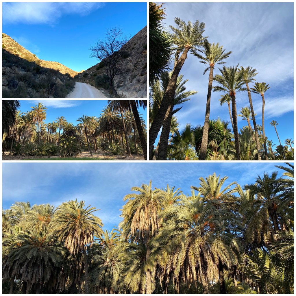 El ascenso culmina en un alto en el que curiosamente hay una pequeña zona urbanizada y un campo de golf, algo absolutamente fuera de lugar y una especie de oasis en medio de la aridez circundante. Desde aquí un largo descenso me lleva hasta las puertas de Elche y su famoso palmeral, declarado Patrimonio de la Humanidad. Aprovecho la travesía de la ciudad para desayunar en un bar antes de continuar la ruta.