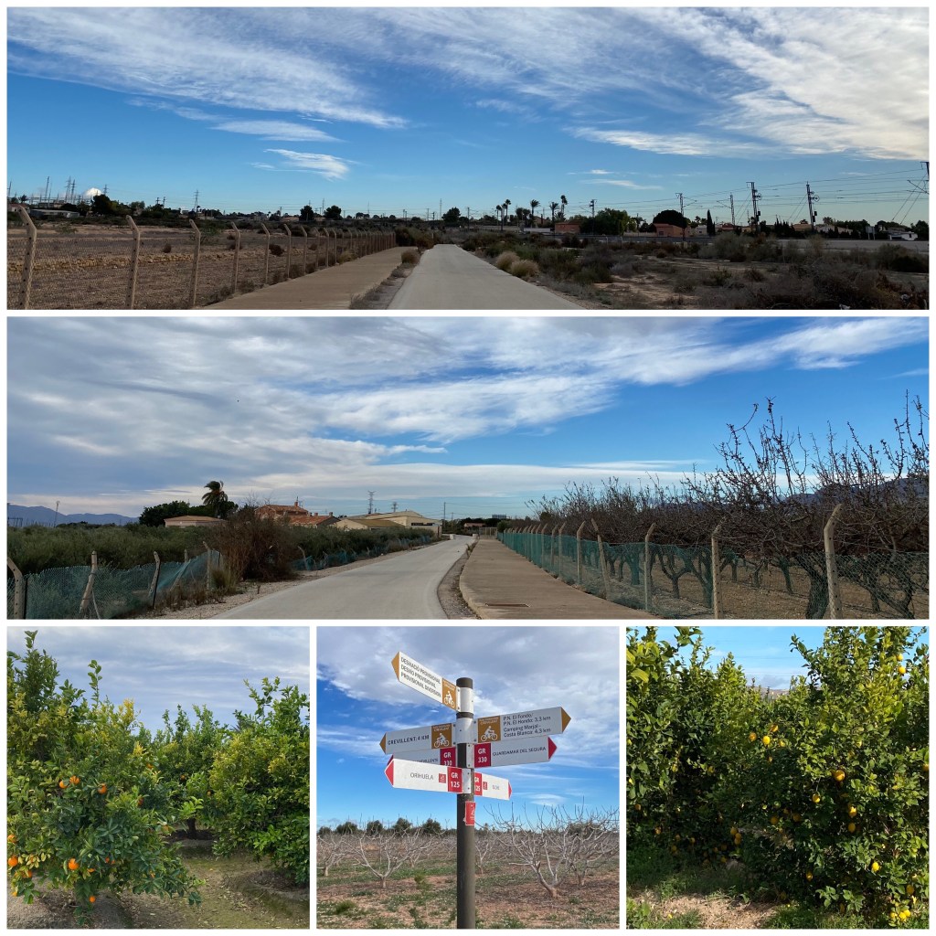 Los siguientes kilómetros son probablemente los menos interesantes de todo este Camino del Cid-La defensa del Sur. A la salida de Elche, siguiendo una pista asfaltada que da servicio a un canal de riego, se avanza durante más de quince kilómetros por una zona bastante degradada: campos abandonados, matorrales, terreno seco, árido, casas muy poco armoniosas construidas aquí y allá sin ningún orden ni concierto y en general un paisaje bastante insulso. Pasada la estación de Crevillente la cosa mejora y se avanza por una zona agrícola mucho más interesante. Aquí hay campos de naranjos, de granados, de olivos y de limoneros.