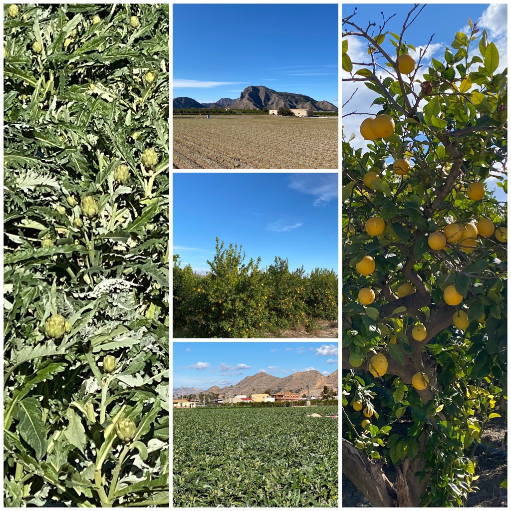Siempre por asfalto recorro los últimos kilómetros antes de Orihuela. Paso por pueblos como Albatera, Cox, Callosa de Segura o Redován, y zonas cada vez más agrícolas a medida que me voy acercando a la vega del río Segura. Predominan los cítricos, muy especialmente limones, aunque ya llegando a Orihuela también veo grandes plantaciones de alcachofas.